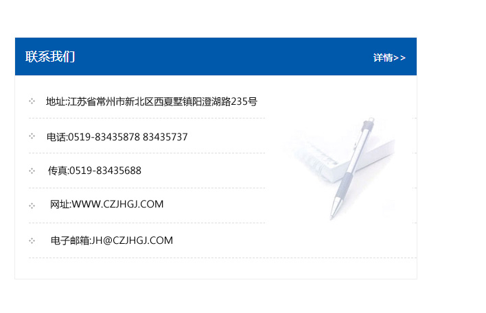 地址:常州市新北區友邦商務大廈1幢16、17層  電話:0519-85101652  傳真:0519-85112595  郵編:213022  網址:www_cz-jiayue_cn.jinzuanlang.com  郵箱:xiajifengaa@163.com